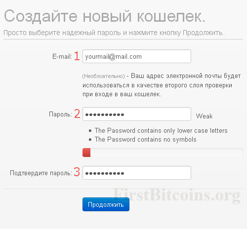 Затем введите свой e-mail (1) и пароль (2,3). Длина пароля должна быть не менее 10 символов, обязательно сохраните его где-нибудь (запишите на бумажке).