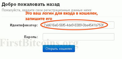 После того, как сохранили фразу, жмите "Продолжить" - переход на страницу с данными для входа в кошелек. В первом поле вы увидите набор цифр и букв – это ваш идентификатор для входа, запишите его. Во второй строке введите свой пароль и нажимайте на "Открыть кошелек".